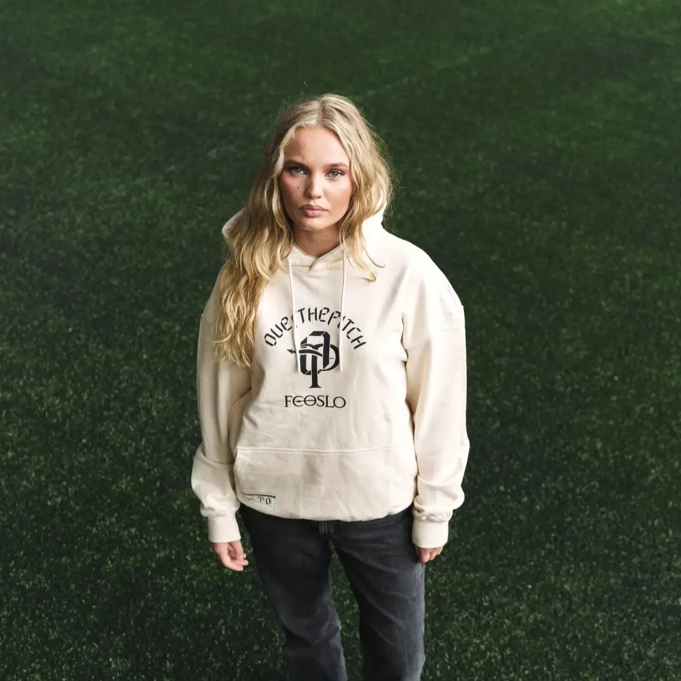 The FC Oslo x Over The Pitch beige hoodie features bold chest branding, crafted from soft materials for comfort and a relaxed fit. Its neutral tone and standout design make it a stylish, versatile piece for fans looking to represent FC Oslo.