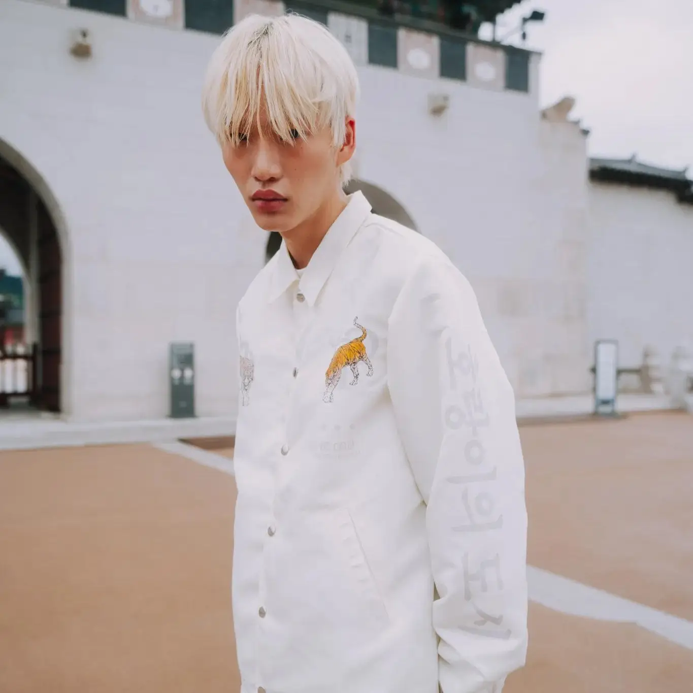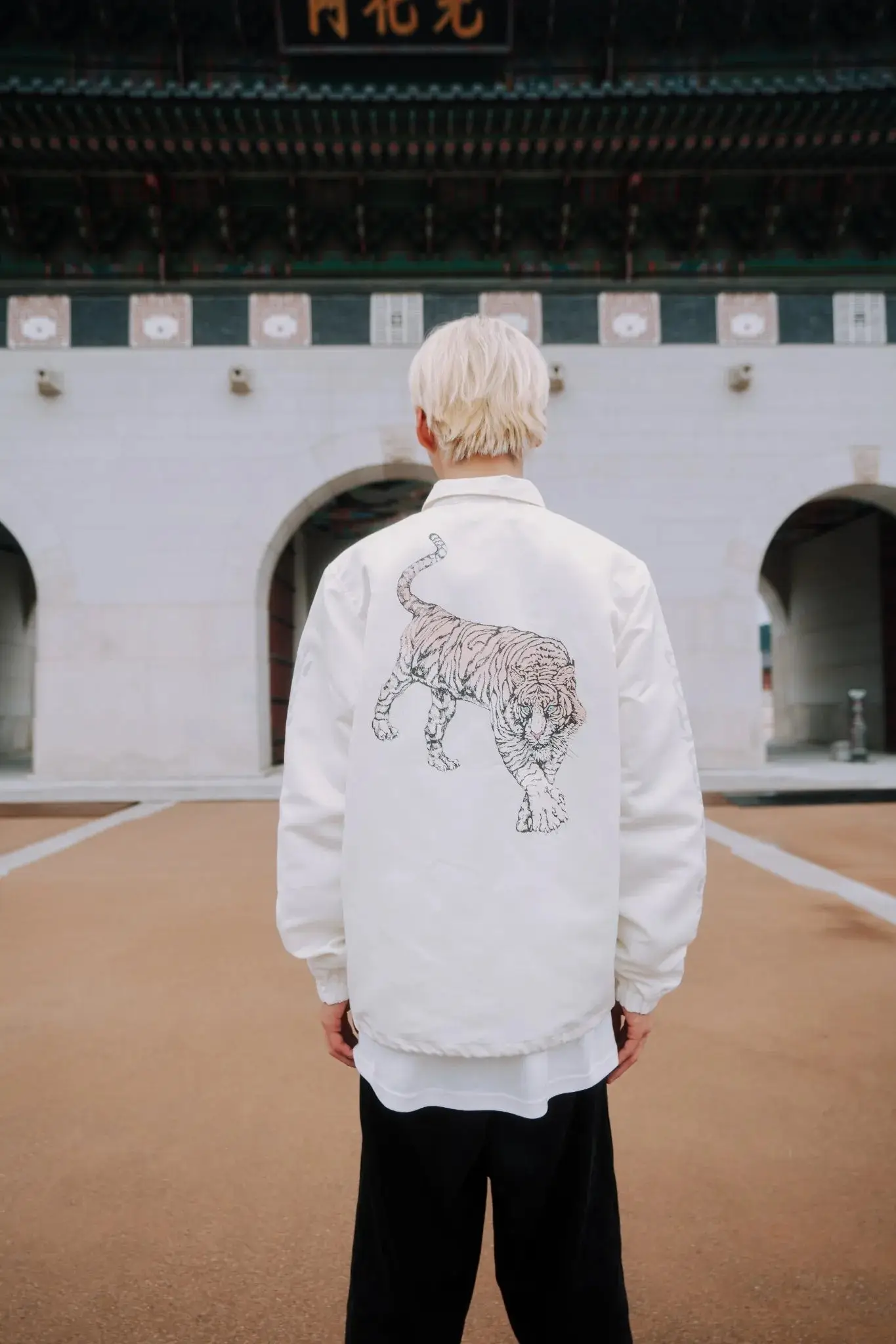 This coach jacket, crafted from sleek glossy polyester, exudes a refined yet effortlessly cool vibe. The striking tiger graphics on the front and back, coupled with distinctive sleeve lettering, elevate its bold aesthetic. Available in ivory or black, it offers versatility while the button closure and adjustable drawstring hem provide a tailored, comfortable fit. A statement piece that fuses modern luxury with everyday practicality, perfect for those who value style with an edge.
